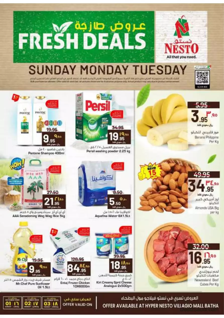 the best offers and discounts offered by nesto hypermarket saudi arabia, riyadh - al batha village mall, from 1st to 3rd october 2023, on food, meat, fish, vegetables, fruits, ready-made meals, bakery products, household items, electronics, mobiles, cleaning products, and other products.